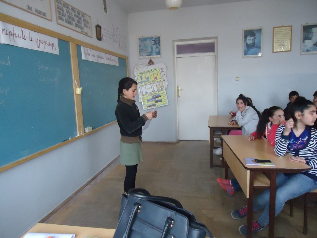 Since February 2016 Lusine Aleksandryan twice a month conducted trainings in school 30 having a preliminary agreement with the director and teachers of the school. The trainings cover the issues on democracy, political structure of different states and Armenia, administrative division of Republic of Armenia, regional departments and local authorities responsibilities, elections, citizens’ participation in decision-making processes, human rights etc. The trainings were implemented with interactive methods, games and opinions exchange involving the school children from 12-15 age range. The children showed great interest and enthusiasm and actively participated in the trainings. Unfortunately, only one third of those children mastered knowledge about the discussing issues and for many of them these themes were quite a novelty.
