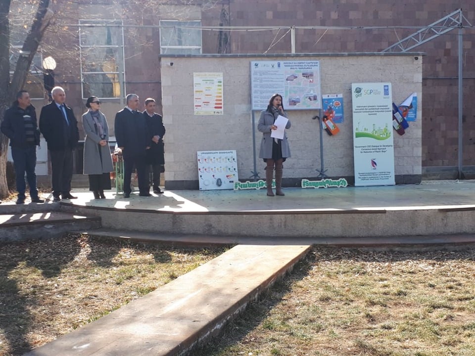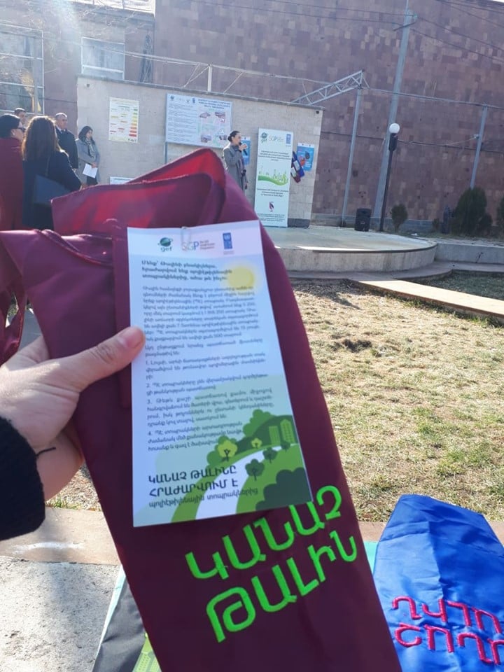 As an alternative of plastic bags a sewing of 1696 tote-bags was ordered to a small LTD functioning in Talin city. The tote-bags dissemination event took place on 20th of November, 2019 in the park Burg Le Valance with the participation of Mrs. Irina Ghaplanyan, Deputy Minister of Environment, Mr, Sargis Aramyan, a mayor of Talin, Mr. Hovhannes Ghazarayan and Mrs. Svetlana Harutyunyan, UNDP GEF/SGP national coordinators, project team and Talin population. A cultural performance on behalf of Talin Arts schoolchildren was followed after the official part, and the rest of the day the dissemination of tote-bags kept on going in the park. The municipality took responsibility to disseminate the rest of tote-bags to the population in the following days from their premise. The event was organized in cooperation with local NGO “SEMANT” implementing a project on Clean Energy access in Talin.